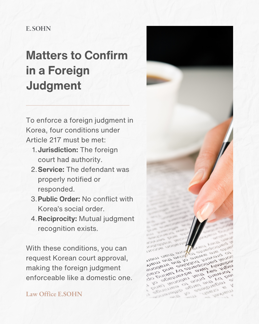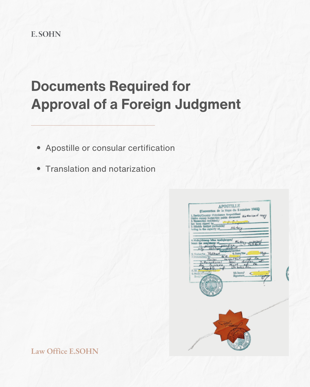 If these four conditions are met, a petition for approval of the foreign judgment can be filed with a Korean civil court. Once approved, the foreign judgment will have the same enforceability as a Korean court judgment.