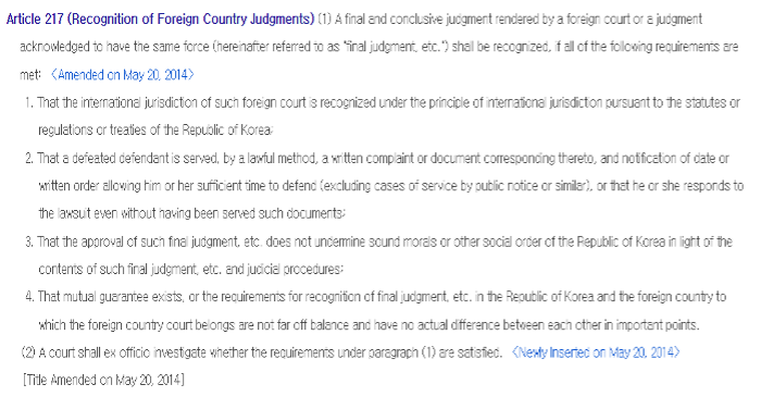 For a foreign court judgment to be approved by a Korean court, it must meet the requirements outlined in Article 217 of the Civil Procedure Act. In summary, these requirements are: 1) the foreign court must have proper jurisdiction, 2) the losing defendant must have received lawful service or responded to the lawsuit, 3) approving the foreign court’s judgment must not contravene Korea’s public morals or social order, and 4) there must be reciprocity.